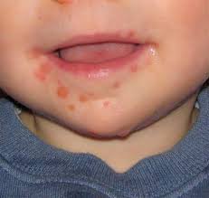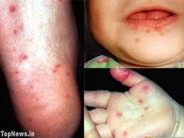 Bersamaan dengan itu timbul rash/ruam atau vesikel (lepuh kemerahan/blister yang kecil dan rata), papulovesikel yang tidak gatal ditelapak tangan dan kaki. Kadang-kadang rash/ruam (makulopapel) ada dibokong. Penyakit ini umumnya akan membaik sendiri dalam 7-10 hari, dan tidak perlu dirawat di rumah sakit.